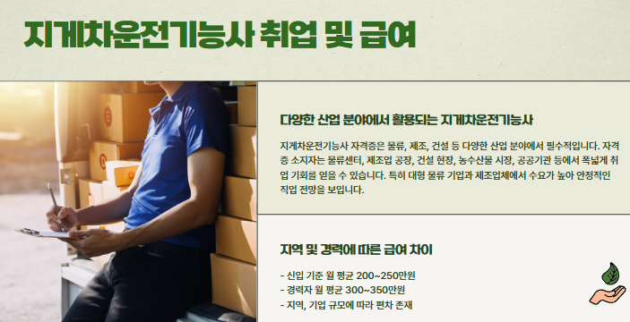 지게차는 물류창고, 공장, 건설 현장, 도매시장 등 다양한 산업 분야에서 광범위하게 사용되며, 자격증이 있으면 취업 시 우대받거나 법적으로 필수인 경우도 많아, 안정적인 직장 생활을 원하는 분들에게 매우 유리한 자격입니다.