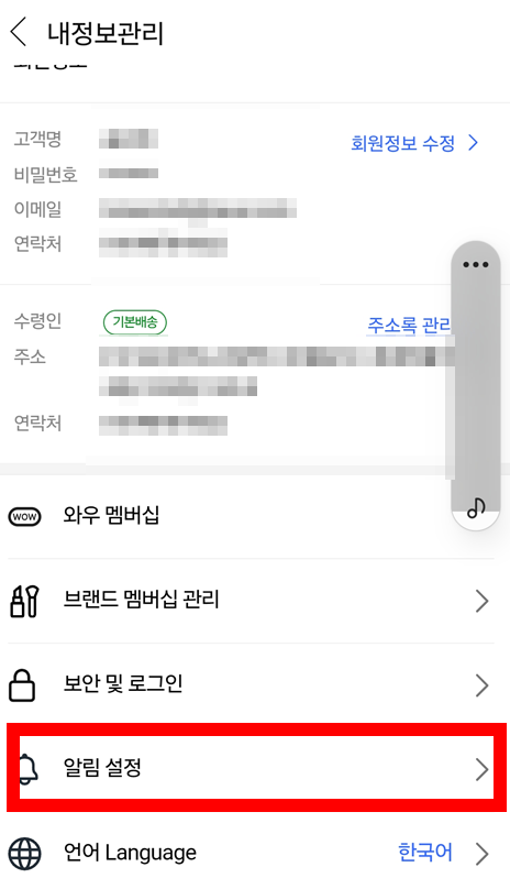 3. 내정보관리에서 알림 설정 클릭!