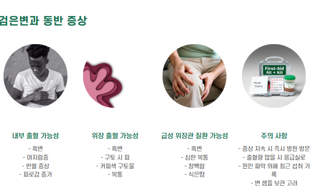 - 최근 위장 질환 진단 받았거나 위암 가족력 있는 경우 흑변 발견 시 지체 없이 병원 방문