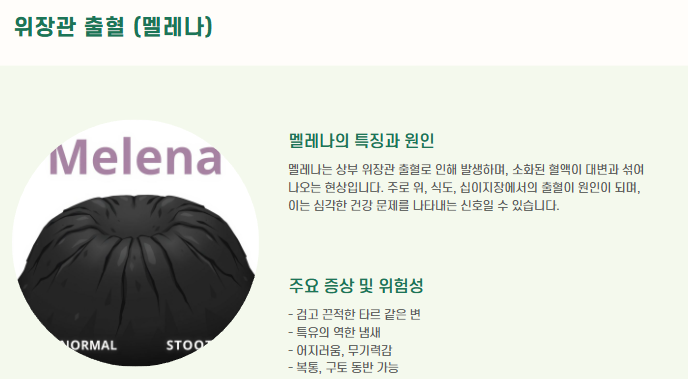 | 흑변 + 구토 시 피 또는 커피색 물질 | 위장 출혈 가능성 |