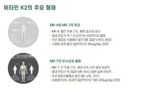대표적인 형태는 MK-4와 MK-7이며, 특히 MK-7은 흡수율과 체내 지속 시간이 뛰어나 건강기능식품에 많이 사용됩니다.