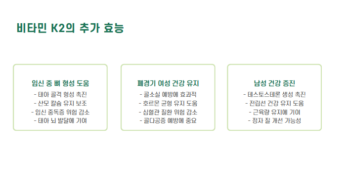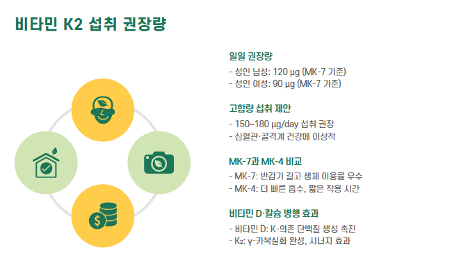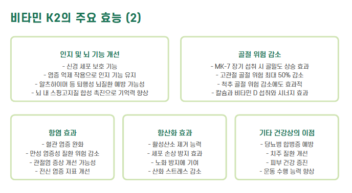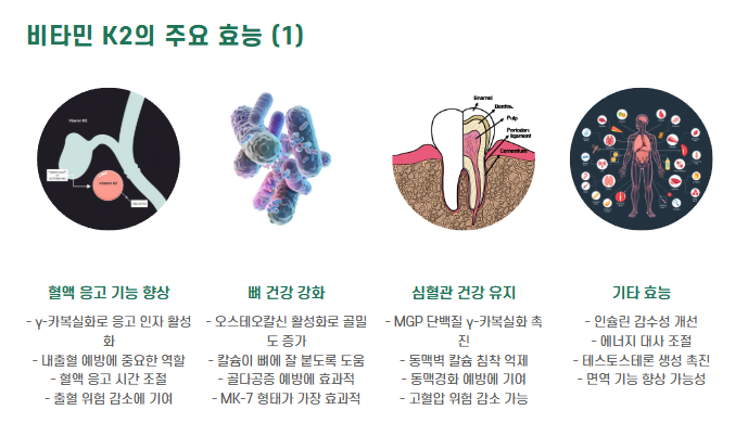 | 뼈 건강 강화 | 오스테오칼신 활성화 → 칼슘이 뼈에 잘 붙게 해 골밀도 증가 및 골다공증 예방. MK-7이 가장 효과적. |