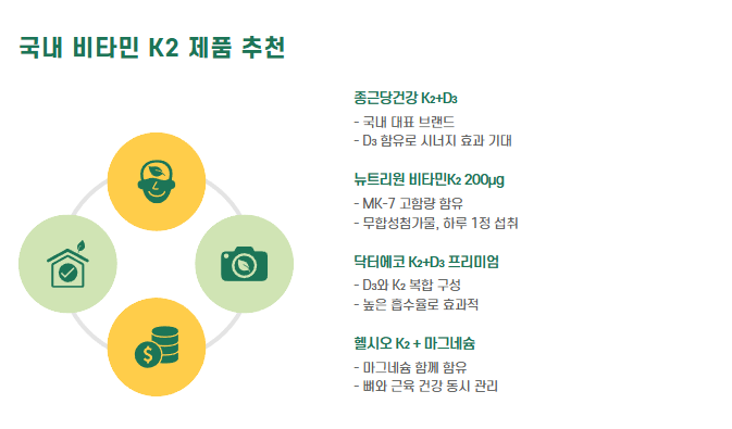 | 1 | 종근당건강 K₂+D₃ | 국내 대표 브랜드, D₃ 함유로 시너지 효과 |