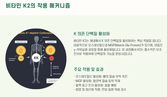| 심혈관 건강 유지 | MGP 단백질 γ-카복실화 → 동맥벽에 칼슘 침착 억제 → 동맥경화, 고혈압 예방에 기여. |