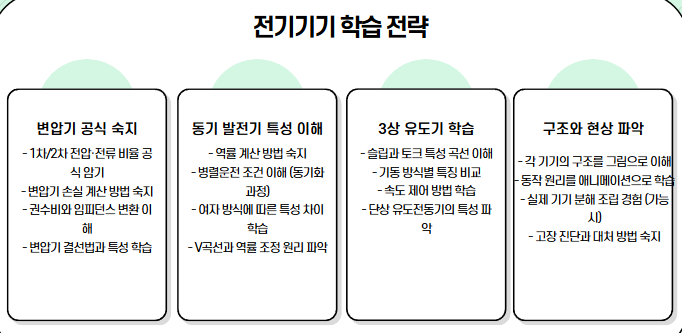 | 전기기기 | 변압기, 동기기, 직류기, 유도기 등 전기기기의 원리와 특성 이해. 회전방향, 효율, 손실 등 계산 문제 자주 출제. |