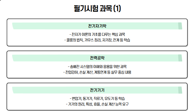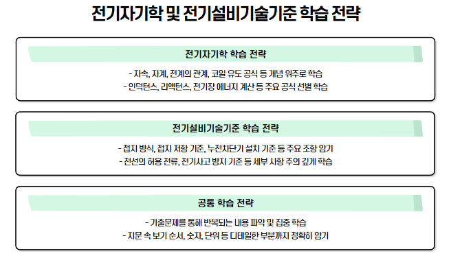 | 전기설비기술기준 및 판단기준 | 전기설비 안전기준과 법적 기준에 대한 암기형 과목. 조항 위주 문제로 자주 출제되는 기준에 집중해 암기 필요. |