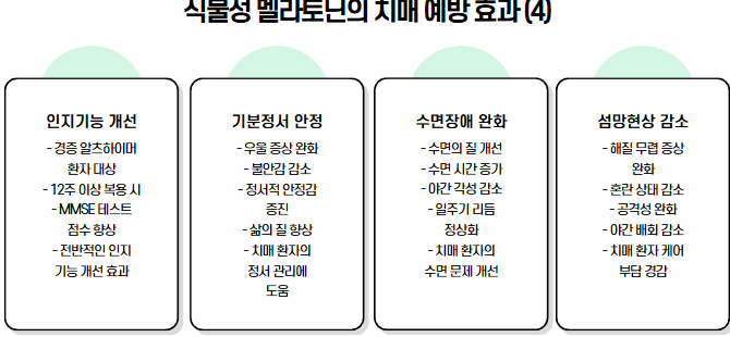 - 경증 알츠하이머 환자 대상 12주 이상 복용 시 인지 테스트(MMSE) 향상 사례 보고
