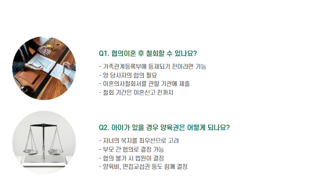 * 협의이혼은 변호사 없이도 가능하지만, 자녀 양육권·재산분할 등 이해관계가 얽히면 법률적 자문이 필요합니다.