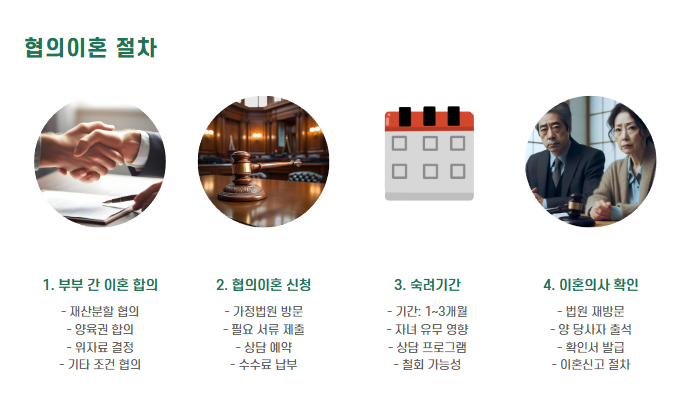 | 협의이혼 | 가족관계증명서, 혼인관계증명서, 주민등록등본, 신분증, 자녀 양육 협의서 |