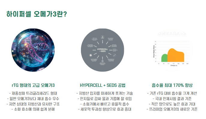 하이퍼셀 오메가3는 일반 오메가3보다 체내 흡수율이 뛰어난 rTG(재중성화 트리글리세리드) 형태의 고급 오메가3 제품입니다. 특히 ‘HYPERCELL + SEDS 공법’을 적용하여 지방산 입자를 작게 쪼개고 인지질로 감싸 물과 기름 모두에 잘 섞이도록 설계돼, 소화기에서 흡수가 빠르고 효율적으로 이루어집니다.