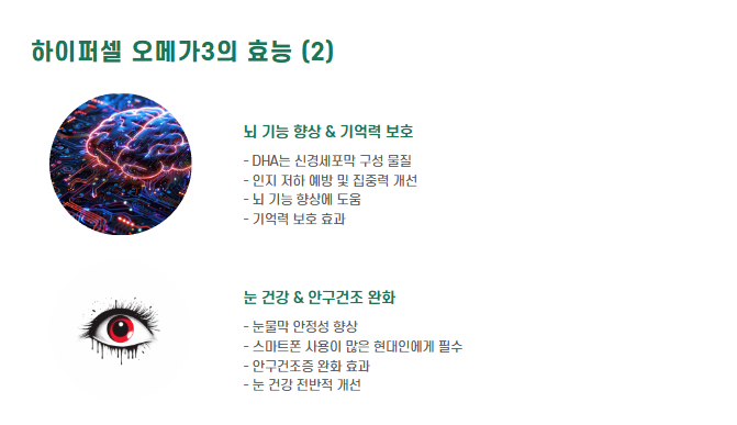 DHA는 신경세포막 구성 물질 → 인지 저하 예방, 집중력 개선