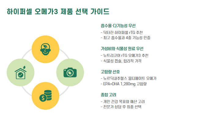 - 흡수율·다기능성 우선 → 닥터린 하이퍼셀 오메가3