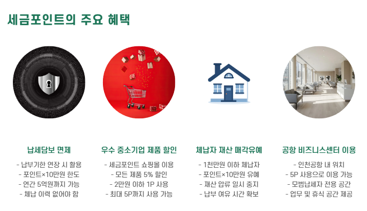 개인과 중소기업이 소득세나 법인세를 납부한 실적에 따라 포인트를 적립받고, 적립된 포인트로 다양한 혜택을 누릴 수 있습니다.