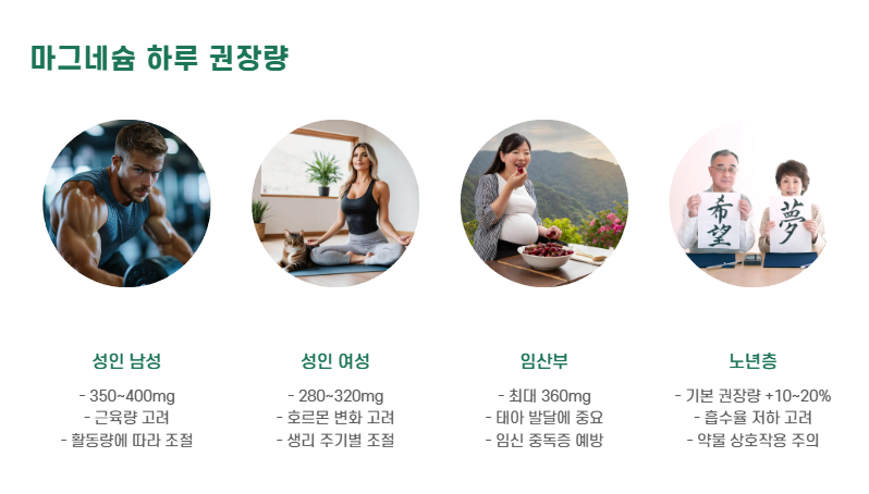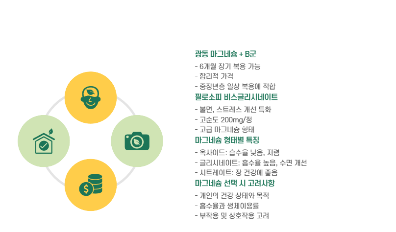 | 광동 마그네슘 + B군 | 가성비 우수, 장기 복용용 | (정량 비공개) | 중장년층 일상 섭취용 |