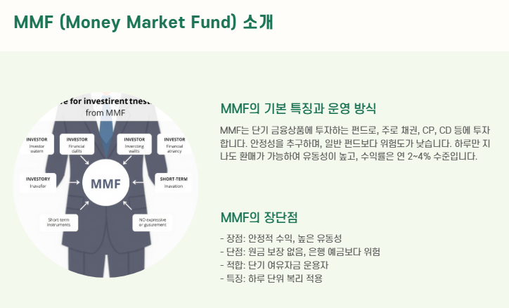 MMF(Money Market Fund)는 초단기 금융상품(기업어음, 국공채 등)에 투자하는 단기 수익형 펀드입니다.