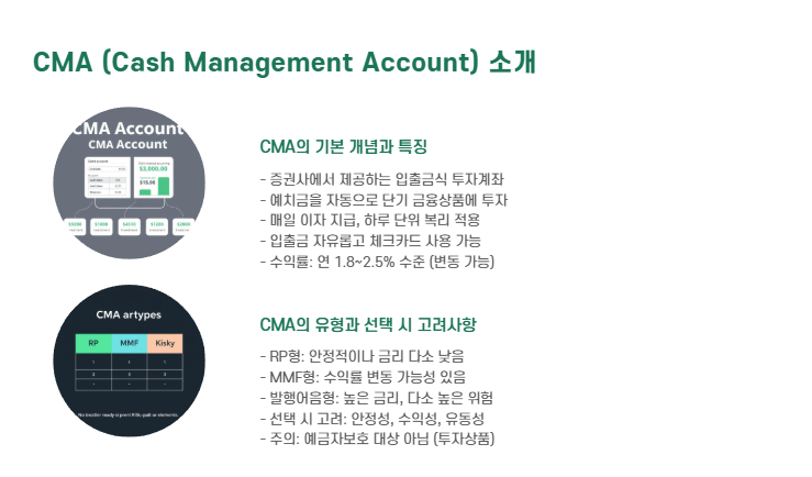 CMA(Cash Management Account)**는 증권사에서 개설하는 입출금 가능 투자계좌입니다.