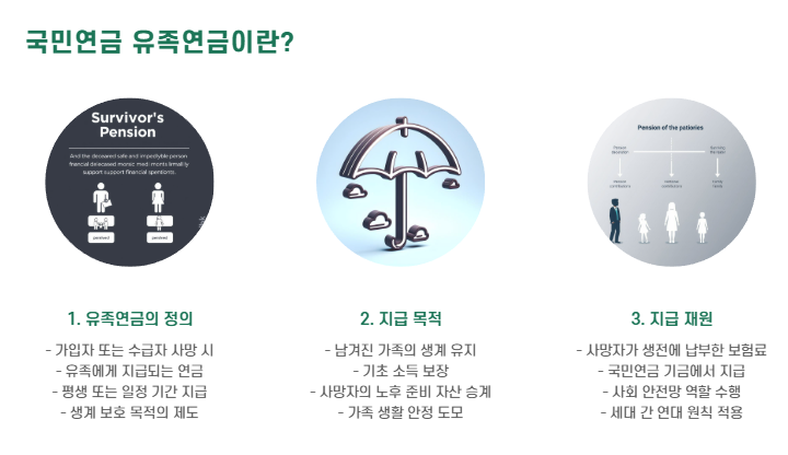 즉, 국민연금 유족연금은 가족의 생계를 보호하고, 사망자의 노후 준비 자산을 가족이 이어받는 제도입니다.