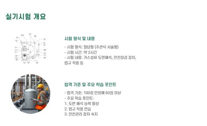 - 시험내용: 가스설비 도면해석, 안전점검 절차, 법규 적용 등