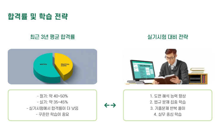 - 최근 3년 평균 합격률: 필기 약 40-50%, 실기 약 35-45%
