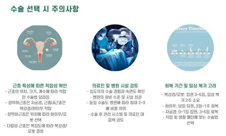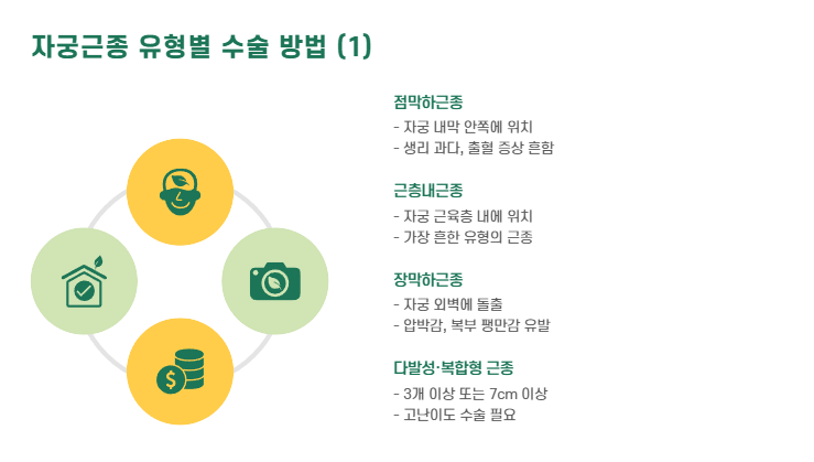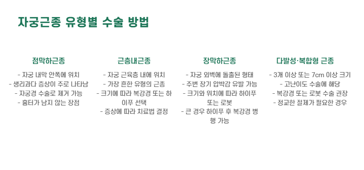 | 근층내근종 | 자궁 근육층 내, 가장 흔함 | 복강경 or 하이푸 | 크기 따라 선택 |