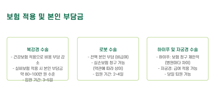 – 복강경·로봇은 입원 3~5일, 병실·식대 발생 - 보험 청구는 수술 전 확인 필수