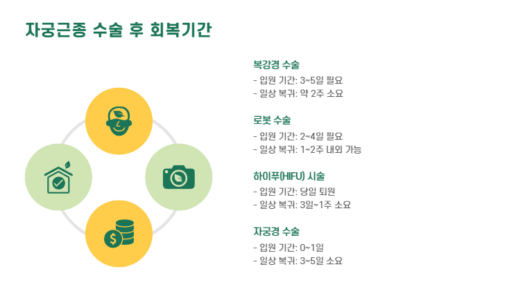 * 대부분의 수술은 2주 이내 일상 복귀 가능하나, 개인 체질, 근종의 크기·위치에 따라 회복 속도 차이가 있습니다.