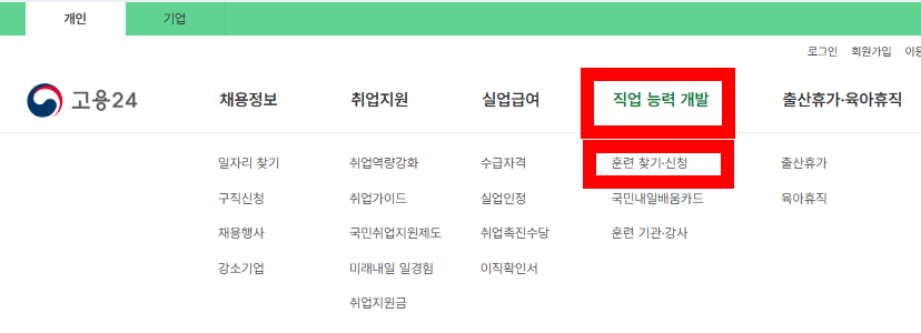 - 고용24 홈페이지 → 회원가입 → 내일배움카드 신청