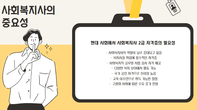 그중에서도 사회복지사 2급 자격증은 복지시설 취업뿐 아니라 사회복지직 공무원 시험에도 필수적으로 요구되는 자격입니다.