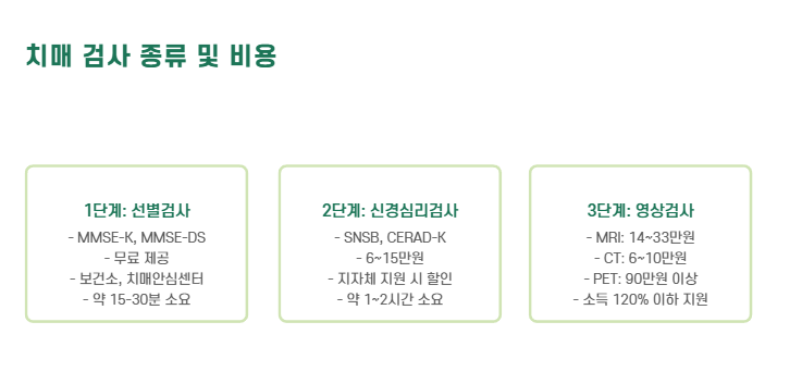 | 1단계 | 선별검사 (MMSE-K 등) | 무료 | 보건소/안심센터 제공 |