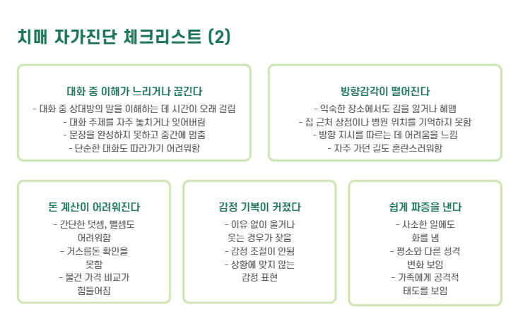 | 중기 | 길 잃기, 대화 혼란, 계산력 저하, 성격 변화 |
