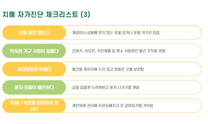 아래 항목 중 6개 이상 해당된다면 전문 치매 검사를 권장합니다.