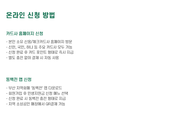 - 온라인 신청 시 신용/체크카드 포인트 형태로 지급되어 바로 사용 가능