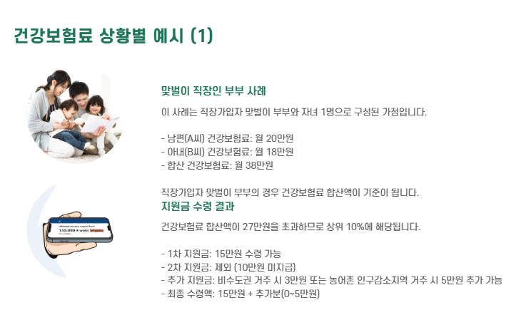 - 두 사람의 건보료 합산이 27만 원 초과 → 상위 10% 해당