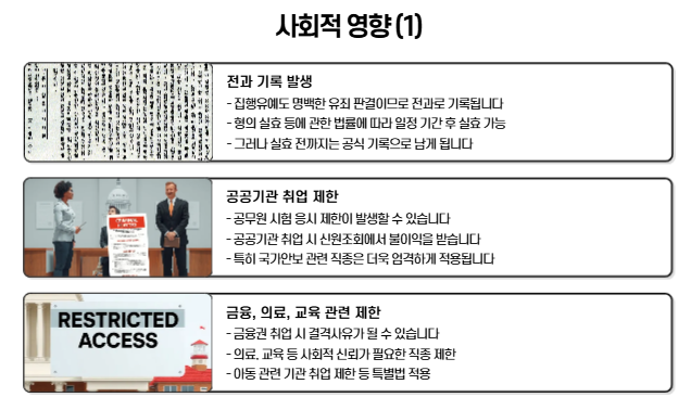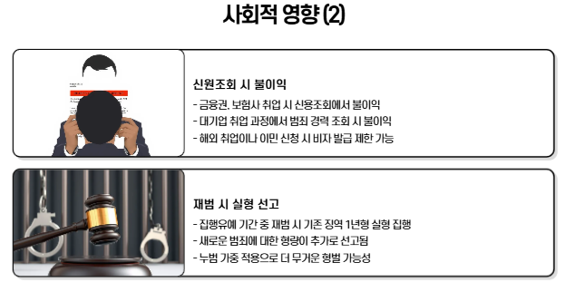 금융권, 보험사, 대기업 취업 등에서 신용조회 또는 범죄 경력 조회 시 불이익 가능성이 있습니다. - 재범 시 실형 선고