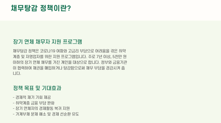 채무탕감 정책이란 장기 연체 채무(7년 이상, 5천만 원 이하)를 가진 개인을 대상으로 정부와 금융기관이 채권을 매입 또는 탕감하여 채무 부담을 경감함으로써 재기의 기회 제공 및 경제적 회복 지원을 목표로 합니다.