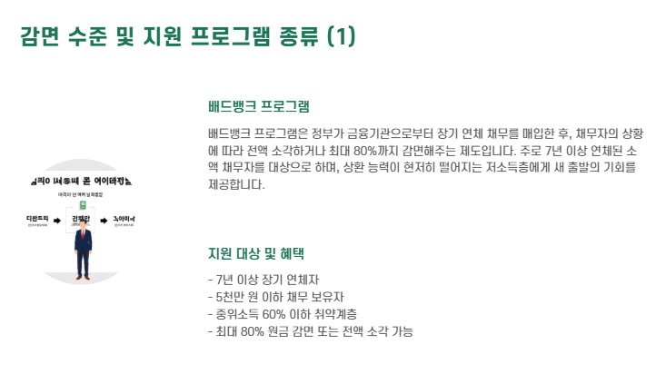 - 배드뱅크 프로그램: 장기 연체 채무를 정부가 매입 후 전액 소각 또는 최대 80% 감면