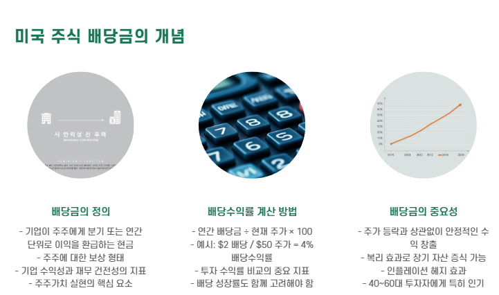 미국 주식 배당금은 장기투자자에게 안정적인 수익을 제공하는 중요한 수단입니다. 특히 고배당주는 매 분기 현금흐름을 기대할 수 있어 40~60대 투자자에게 인기가 높습니다.