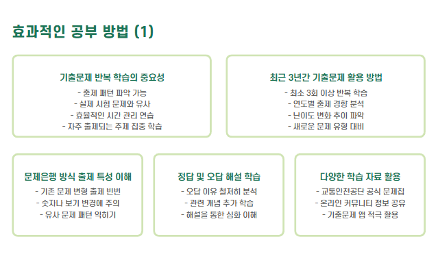 - 복잡한 법규나 암기 요소는 영상을 반복 시청하며 자연스럽게 암기하는 것이 효율적입니다.