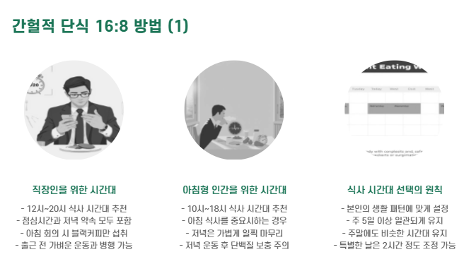 간헐적 단식 16:8은 하루 24시간 중 16시간은 단식하고, 8시간만 식사를 하는 방식입니다.
