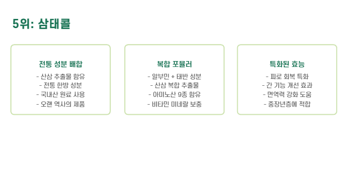 | 5 | 삼태콜 | 액상 | 산삼 + 태반 + 알부민 복합 포뮬러 |