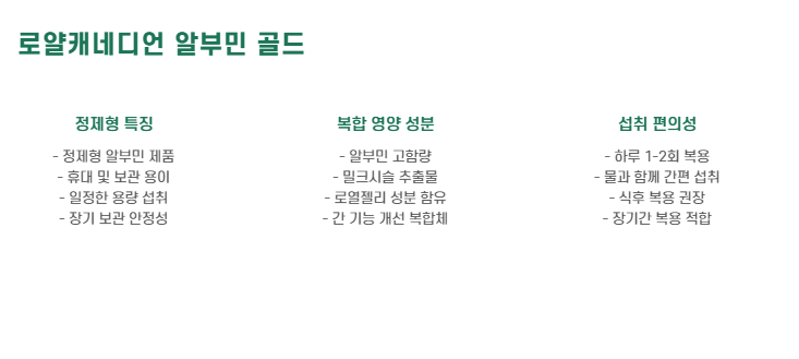 | 4 | 로얄캐네디언 알부민 골드 | 정제 | 밀크시슬 + 로열젤리 포함 |