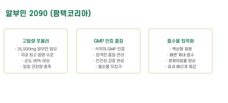 | 3 | 알부민 2090 (팜텍코리아) | 액상 | 25,500mg 고함량 + GMP 인증 |