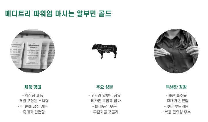 | 1 | 메디트리 파워업 마시는 알부민 골드 | 액상 | 고함량 + 휴대 간편 |