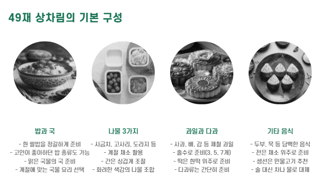 49재 상차림은 전통 제사와 비슷하지만, 약간 간소화된 형태입니다.