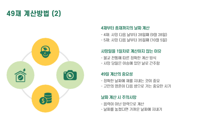 49재는 사망일 다음 날을 기준으로 1일차로 계산합니다. 7일마다 한 번씩 총 7번 재를 지냅니다.