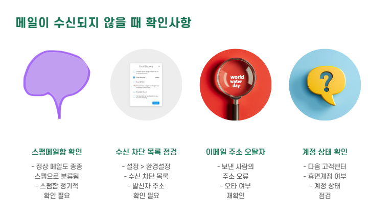 - 스팸메일함 확인: 정상 메일도 스팸으로 분류될 수 있음