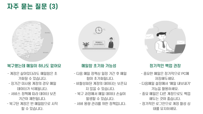 A. 계정은 살아있더라도 메일함은 초기화될 수 있습니다. 백업이 필요한 메일은 정기적으로 저장해 두시는 것이 좋습니다.