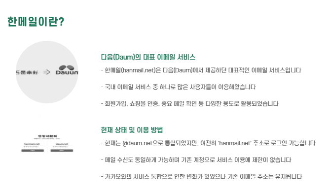 지금은 @daum.net으로 통합되었지만, 여전히 ‘hanmail.net’ 주소로 로그인하거나 메일을 받을 수 있습니다.