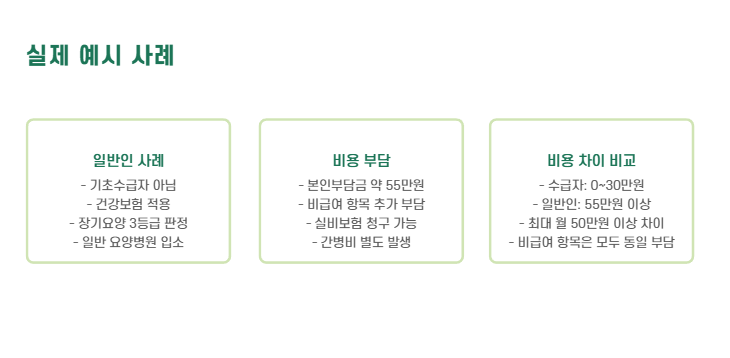 - 요양병원은 의료비 중심이라 비용이 높지만, 기초수급자라면 큰 폭의 감면이 가능합니다.