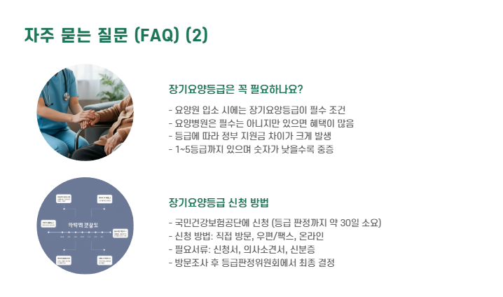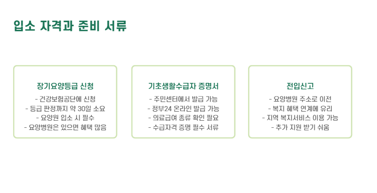 - 요양원은 돌봄 중심으로, 장기요양등급 필수입니다.
